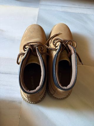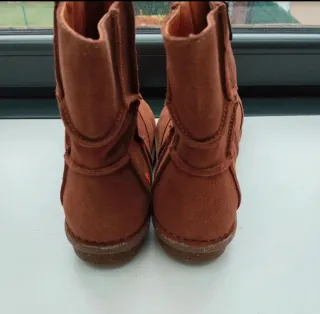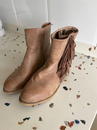 Botines de estilo casual en color marrón. No se han estrenado. Nuevos. - Detalle de tiras y borlas en la parte trasera. - Acabado en material sintético y ante. - Relleno pelo cálido.