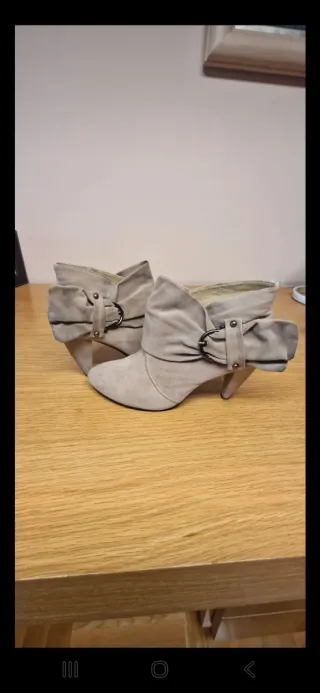 Elegantes botines de ante con un detalle de lazo y hebilla en el lateral. - Diseño con pliegues. - Tacón 9 cm - Material: Ante. La zona de atrás como se puede ver está un poco más oscuro cómo en la última foto se ve