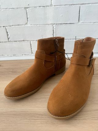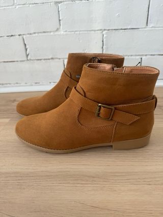 Botines de ante en color camel, talla 39. Un básico para tu armario. - Cierre con cremallera lateral. - Diseño de caña corta. - Puntera ligeramente cuadrada.