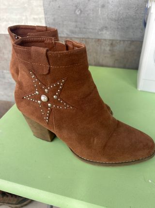 Botines de ante en color marrón, con un diseño de estrella decorada con tachuelas y un detalle central. - Material: Ante. - Adorno: Estrella con tachuelas y perla central. - Cierre: Cremallera lateral.