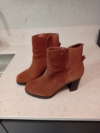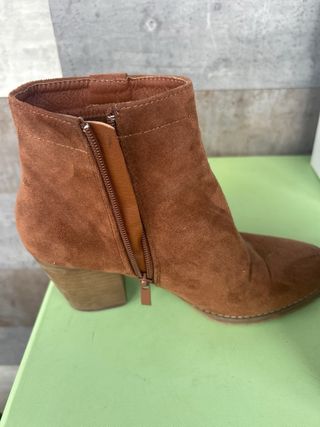 Botines de ante en color marrón. - Tacón grueso. - Cierre de cremallera lateral. - Punta fina,redondeada