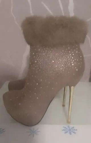 Botines de ante con brillos decorativos y dorado en la parte de atrás. Puesto un solo dia . - Diseño de caña corta. - Tacón grueso y alto. - Cierre de cremallera lateral.