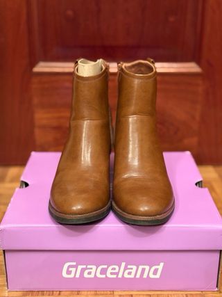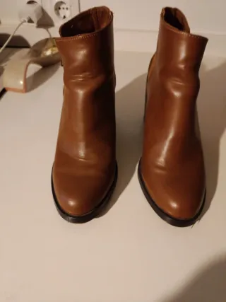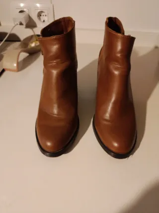Bonitos botines de color cuero puestos dos veces, así que se encuentran en perfecto estado. Número de pie: 39 El tacón es cuadrado. Se cierran con cremallera lateral.