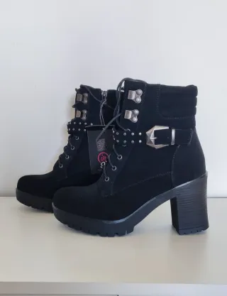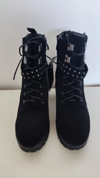 Botines de mujer con un diseño moderno y detalles metálicos. - Acabado en ante sintético. - Adornos de tachuelas en la parte superior. - Cierre lateral con cremallera. Precio negociable