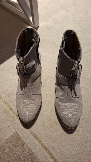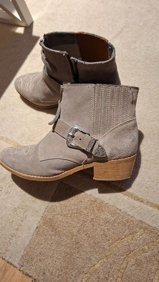 Botines de ante en tono beige y gris. Cuentan con cierre de cremallera lateral. - Material exterior: ante. - Cierre: cremallera.
