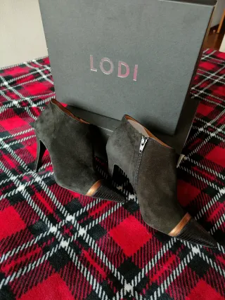 Elegantes botines de la marca Lodi. - Diseño en ante negro. - Detalle metálico dorado en la punta. - Cremallera lateral para facilitar su uso.