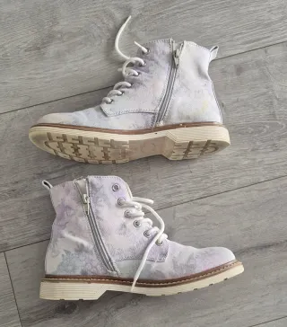 Botines de la marca Catwalk con un diseño llamativo. - Estampado floral en tonos morados y blancos. - Cierre lateral con cremallera. - Cordones blancos para ajuste. - Suela de goma resistente.
