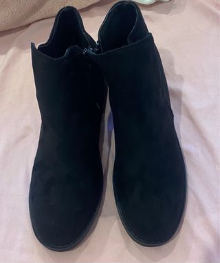 Botines negros con tacón grueso y cremallera lateral. - Material exterior tipo ante. - Tacón cuadrado de aproximadamente 5 cm. - Cremallera lateral para facilitar el calce.