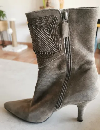 Elegantes botines de ante en color gris, talla 37 - Diseño de caña media. - Tacón fino y estilizado. - Detalle ornamental en la parte delantera. - Cierre lateral con cremallera.