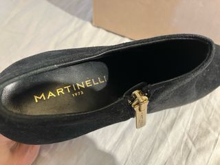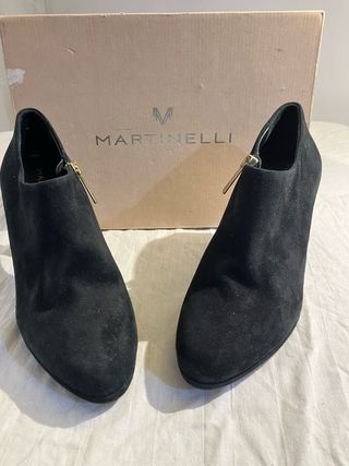 REBAJAS DE NAVIDAD!!! Elegantes botines tobilleros de ante negro con tacón de 8 cm de la marca Martinelli. NUNCA han sido usados aunque la suela tiene señales de roce por haberse probado. Aún están por estrenar con la etiqueta colgando. Valorados en 120 euros originalmente. Descatalogados. - Material: Ante - Color: Negro - Cierre con cremallera dorada