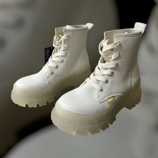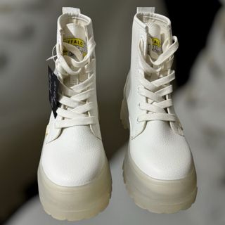Botines de la marca Buffalo en color blanco y material vegano. - Talla 36. - Diseño de botín con cordones. - Suela gruesa y robusta. Nuevos, con etiqueta