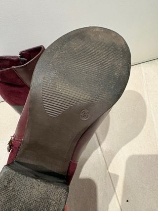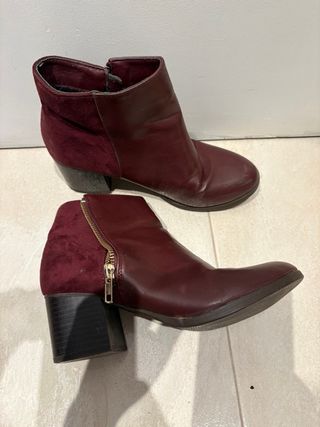 Botines de invierno en color granate con un detalle metálico en el tacón. - Cierre de cremallera lateral. - Detalle de hebilla decorativa. - Tacón con acabado dorado.