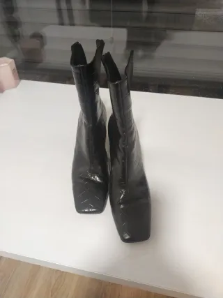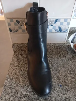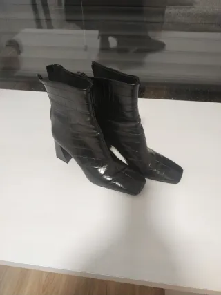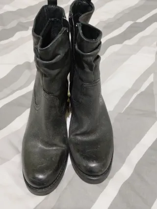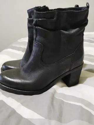 Botines de piel en color negro. Diseño moderno y versátil. Tacón 6 cm. He los utilizados 3 veces solo. - Material exterior: Piel. - Cierre de cremallera lateral. - Detalle de pliegues en la caña. - forro interior cálido