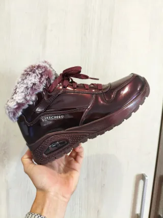 Botines Skechers con un acabado brillante y detalles de pelo sintético. - Diseño tipo botín. - Cierre con cordones. - Forro interior de pelo sintético.