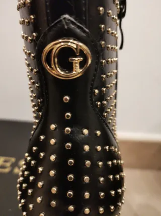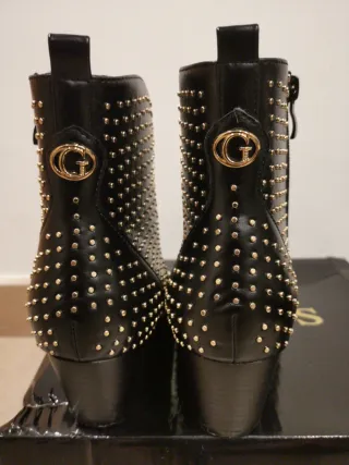 Visita mi perfil, más botines chulos. Botines Guess de estilo cowboy con tachuelas doradas. Solo usados para un evento. Precio en tienda muy superior. - Diseño con tachuelas doradas. - Detalle de logo G en dorado en la parte trasera. - Tacón grueso.