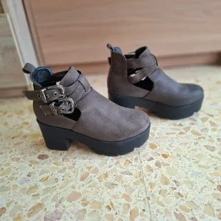 Botines de estilo moderno con detalles de hebillas. - Diseño con cortes laterales. - Plataforma gruesa y tacón robusto. - Cierre con hebillas decorativas.