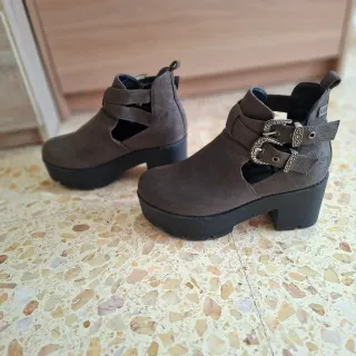 Botines de ante con un diseño moderno y detalles metálicos. - Material: Ante - Color: Marrón verdoso - Adorno de hebillas doradas - Diseño perforado en la parte superior