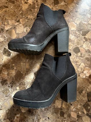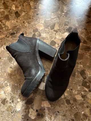 Botines de piel (serraje) con tacón, puestas 2 veces, en muy buen estado. Un calzado versátil y cómodo. - Material exterior: serraje. - Diseño tipo chelsea. - Tacón con forma cuadrada.