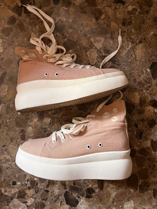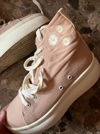 Botines de tela color rosa pálido con un diseño encantador. - Tres bordados de flores blancas con centro amarillo. - Cordones blancos. - Suela de goma blanca.