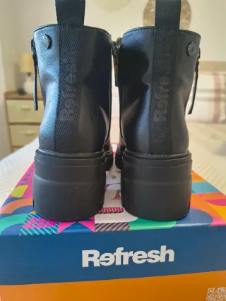 Botines de la marca Refresh en color negro. Cuentan con un diseño moderno y suela de plataforma. - Cierre de cremallera lateral. - Tirador trasero para facilitar su puesta. - Detalle de logo en la caña. - Suela de plataforma gruesa.usados solo dos veces,me quedan algo grandes .