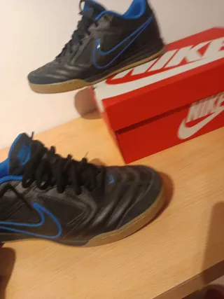 Botines de fútbol Nike Gato en color negro con detalles en azul. Diseñados para un buen agarre en la cancha. Material de piel. Tiene 1 dia de uso. - Diseño deportivo. - Suela de goma. - Cierre de cordones.