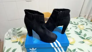 Botines elegantes de color negro. - Material exterior de ante. - Cierre de cremallera lateral. Es muy bonita, es comoda, muy ponible y muy recomendable. Tiene muy poco uso las tapas son las auténtica todavía no la había cambiado