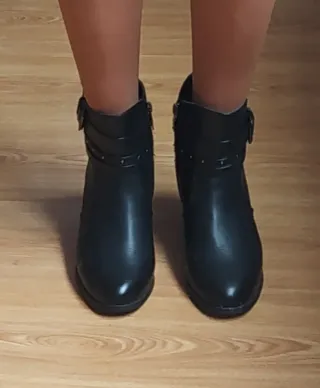 Botines negros de mujer en perfecto estado. - Diseño moderno y elegante. - Cierre lateral con cremallera. - Detalle de hebilla. - Tacón cómodo.