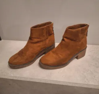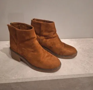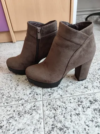 Botines de ante en color marrón, talla 37. - Diseño moderno y versátil. - Cierre con cremallera. - Tacón bajo y cómodo.