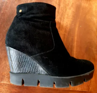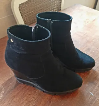Botines negros de cuña con cremallera lateral. - Material exterior de ante. - Tacón de cuña. - Cierre de cremallera. - Muy poco uso, impecables y muy bonitos puestos.