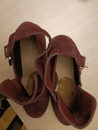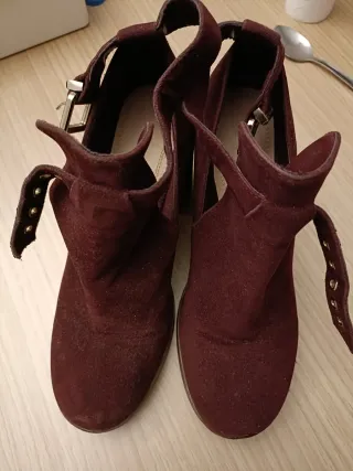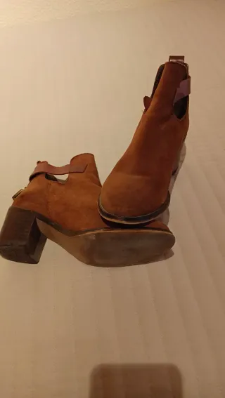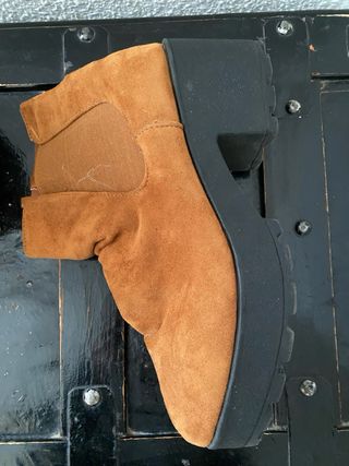 Botínes de serraje de SPRINGFIELD. Son de piel muy suave y con una cuña muy cómoda. A penas unos pocos usos, se puede ver en la foto de la suela.