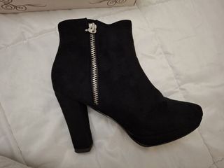 Botines negros con tacón y detalle de cremallera. - Material exterior de ante. - Tacón grueso y plataforma. - Cierre lateral con cremallera plateada.