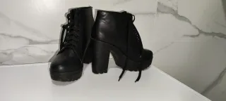 Botines negros modernos y atrevidos, en buen estado en general pero con algunas marcas de uso en los laterales internos del zapato, puestos no se aprecian. Talla 39. - Cierre de cordones. - Tacón grueso. - Plataforma delantera.