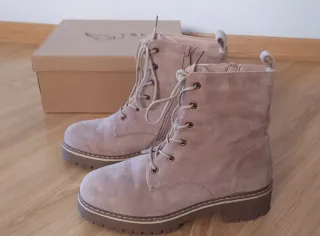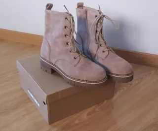 Botines de mujer en color beige, perfectos para el día a día. Pone talla 38 pero es una 37. Los pedí por internet. Y me quedan pequeños y gasto el 38. - Material exterior de ante. - Cierre con cordones y cremallera lateral. - Suela de goma con buen agarre. - Detalle de pespuntes en la suela.