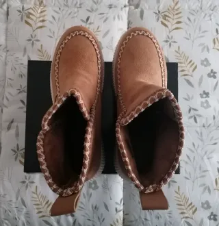 Botines de estilo australiano en color camel, forrados por dentro. Perfectos para un look casual. - Diseño con detalles de costura. - Suela gruesa y antideslizante. - Tirador trasero para facilitar su puesta.