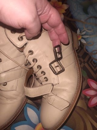 Botines piel color crudo. Tienen 14 cm de altura, se pueden abrochar con cordón y con tiras para ajustar más o menos. Han estado muy usadas, ahora llevan tiempo sin usar guardadas, tienen uso pero aún pueden utilizarse. Eran de marca pero no recuerdo cuál, están en otra caja.