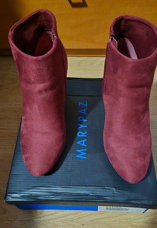 Elegantes botines de la marca Marypaz. - Diseño de punta fina. - Cierre de cremallera lateral. - Material tipo ante.