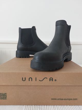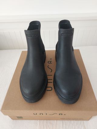 Botines negros de agua tipo chelsea de UNISA, en goma con laterales en tejido elástico. Con las señales lógicas de uso (poco..), pero en muy buen estado y en su embalaje original.