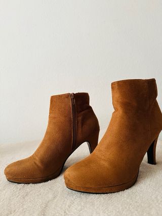 Botines de tacón alto con acabado tipo ante en color camel. - Tacón fino y plataforma. - Cremallera lateral para facilitar el calce. - Diseño elegante y versátil.