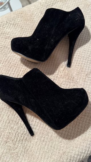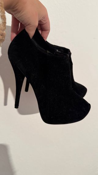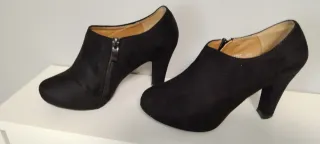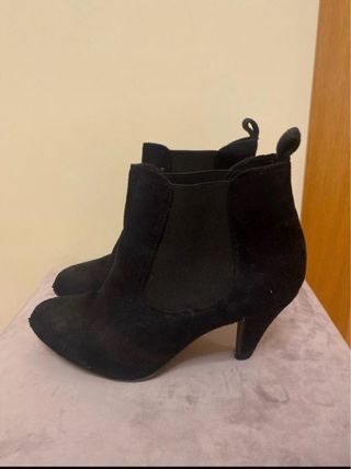 Botines negros de tacón, talla 38-39. Son tres pares de botines. Ideales para cualquier ocasión. - Son de ante. - Tienen cremallera lateral. - Están en buen estado.