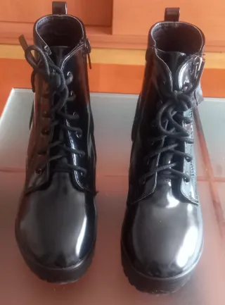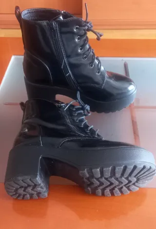 Botines de charol con cordones y cremallera lateral. - Diseño moderno y brillante. - Suela gruesa para mayor comodidad. - Cierre cremallera, cordones de adorno. - Usados en un par de ocasiones. - Suela de 6 cm y plataforma de 3 cm
