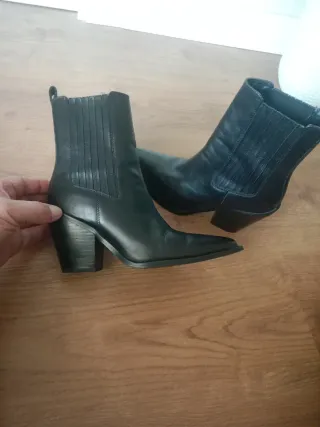 Botas de estilo para mujer, confeccionadas en estupenda piel de bovino color negro. - Diseño de punta afilada. - Tacón grueso y alto tipo cubano. - Detalle de elásticos laterales. Compradas en MANGO , precio compra 75. Sólo me las he puesto un ratillo y me apretan calzo un 38 y medio y son del 38 , las botas son de buena calidad.