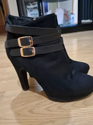 Botines elegantes en perfecto estado. - Son un 39 pero Tallan como un 40. -Pack de los 3 pares por 10€. - Se han usado 2 veces. - Diseño con tres correas y hebillas doradas. - Tacón grueso y plataforma. - Material tipo ante.