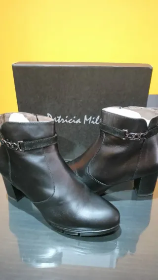 Botines de la marca Patricia Miller en color negro, completamente nuevos. - Diseño elegante con detalle de cadena. - Cierre de cremallera lateral. - Tacón grueso para mayor comodidad.