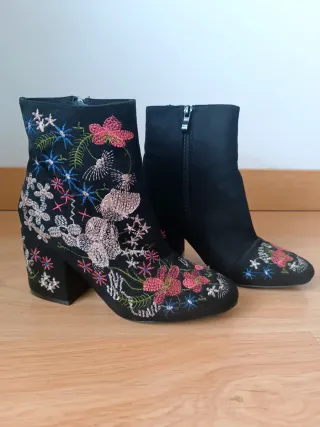 Botines negros con un diseño floral bordado. - Bordados de flores en varios colores. - Tacón grueso.