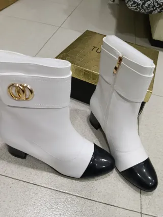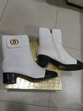 Botines de tacón en color blanco. - Diseño moderno y elegante. - Tacón grueso para mayor comodidad. - Cierre de cremallera lateral. Aunque pone 37 es más un 36'5. Yo llevo un 37 y me aprietan. Poco usadas