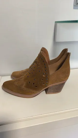 Botín de piel con un diseño moderno y detalles de tachuelas. Número 37 aunque calza grande pk yo uso 38 y me van bien. Marca vas. - Material: Piel. - Color: Marrón. - Diseño con cortes y tachuelas decorativas. - Tacón con acabado de madera.