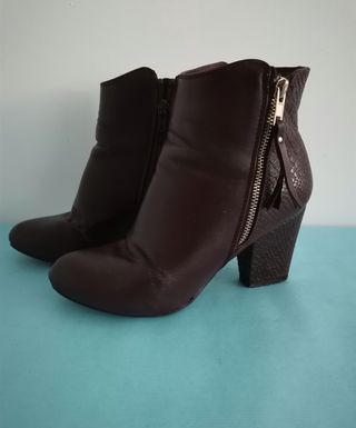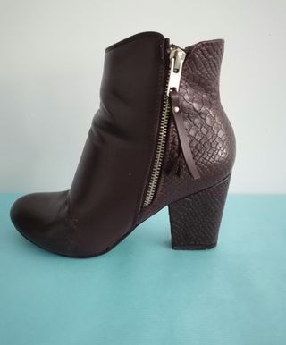 Botines de tacón ancho en color burdeos chocolate. Un diseño elegante y moderno. - Tacón ancho y robusto. - Cierre de cremallera lateral. - Detalle de textura tipo piel de serpiente en el talón. - Puntera redondeada.
