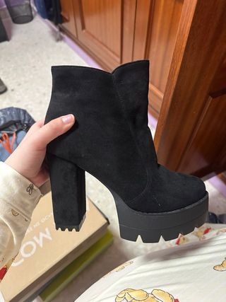 botines tacon alto, mujer , color negro, de piel vuelta, muy ponibles y comodos