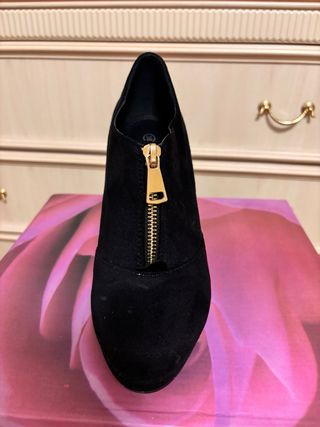 Botines de estilo moderno y versátil. - Diseño de caña baja. - Cierre lateral con cremallera. - Detalle de tirador en la parte trasera. - Tacón de altura media. Tiene como mucho 3 puestas, los pliegues son de estar guardados.
