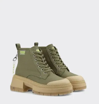 Botines estilo Bohemian en un tono verde oliva. Perfectos para añadir un toque único a tu atuendo. - Diseño de botín alto. - Cierre con cordones negros. - Puntera redonda.